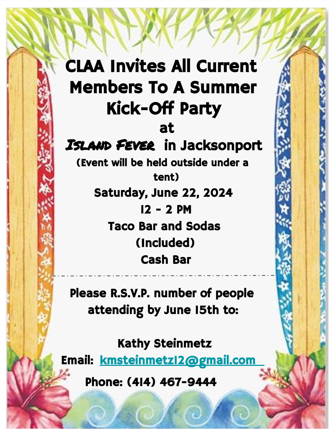 CLAA invites all current paid members to a Summer Kick-Off Party at Island Fever in Jacksonport. A taco bar and sodas will be included and there will be a cash bar. This event will be held outside under a tent. CLICK HERE to view the PDF flyer for this event.